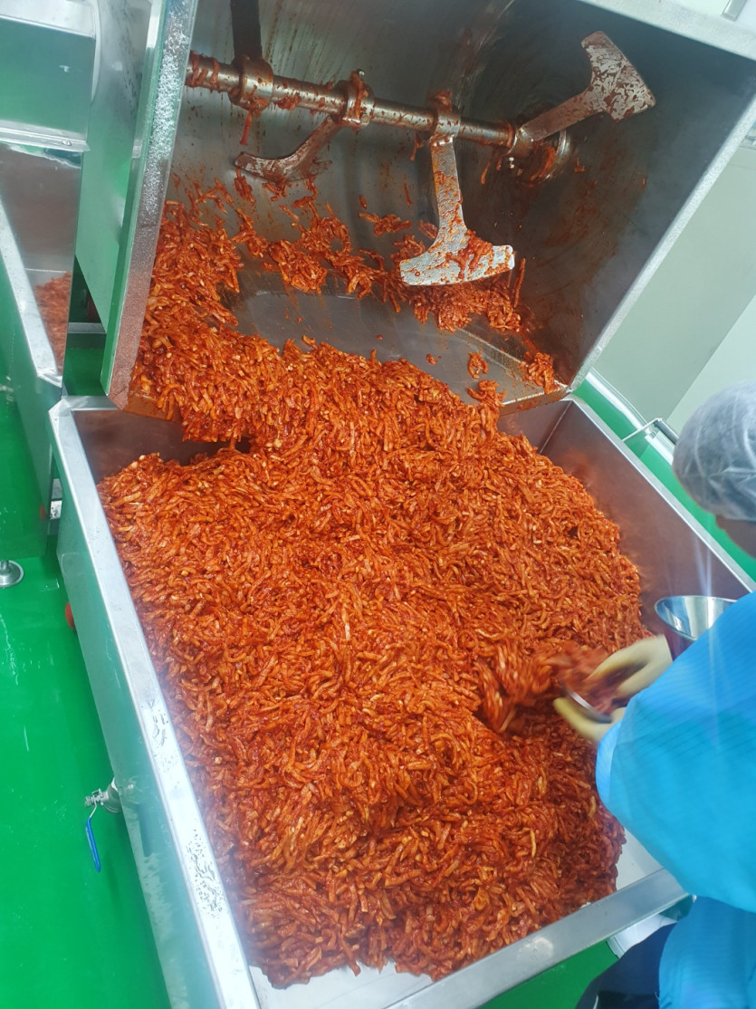 혼합기계로 사람이 버무리는 양념이아닌 기계가 자동으로 양념을 버무린후에 보이는 이동대차에 정지한상태에서 양념을 붓습니다